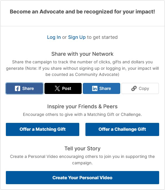 - Copy your link and share with your network. If you share without signing up or logging in, your impact will be counted as Community Advocate.